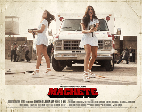 There have been several images from Machete in all its colorful glory posted in several sites. The film is getting close to release and features some beautiful women in Jessica Alba and Michelle Rodriguez. They will be both trying to woe Danny Trejo who plays the main character in this Grindhouse style film.